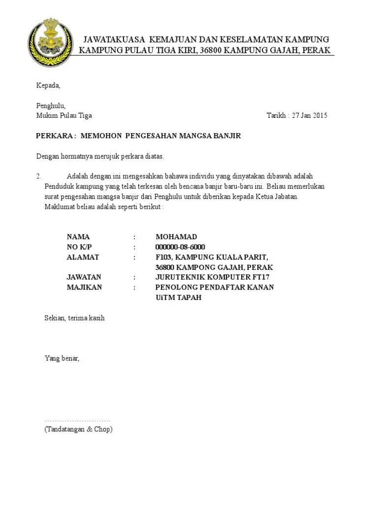 Syarikat bekalan air selangor tsunami di pulau pinang tax incentives in malaysia 2017 nota sains . Contoh surat pengesahan pendapatan suri rumah. Ketua kampung surat pengesahan tempat tinggal. Surat pengakuan penghulu / ketua kampong.
